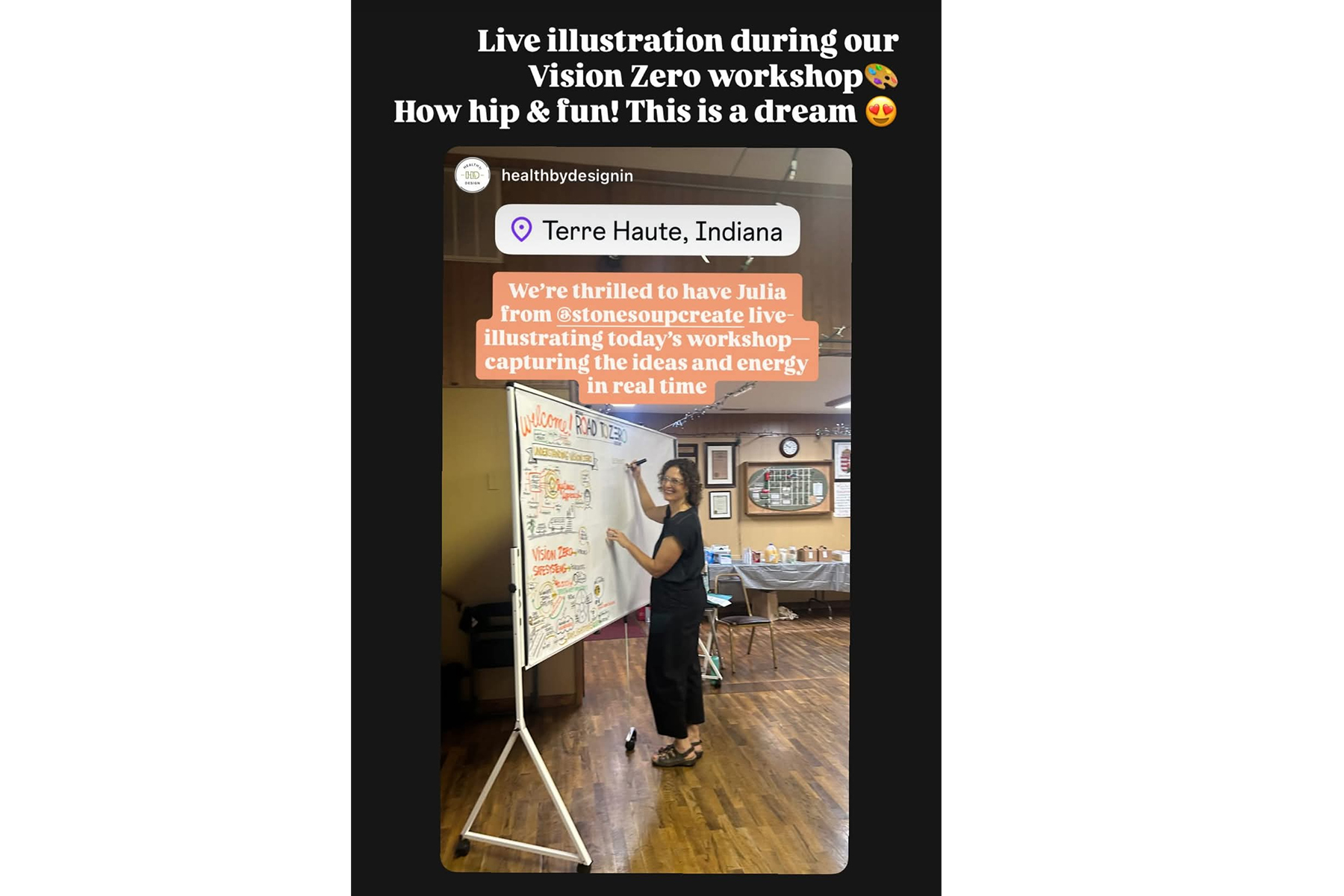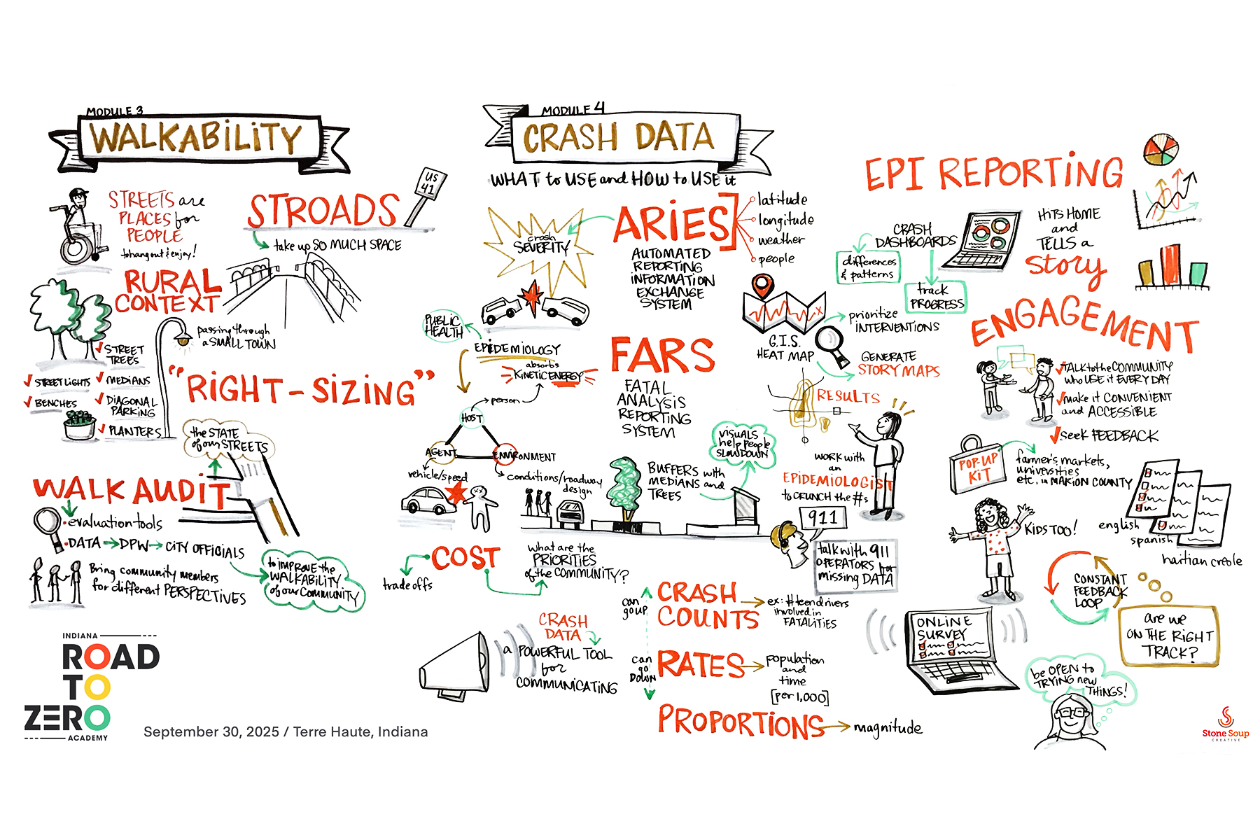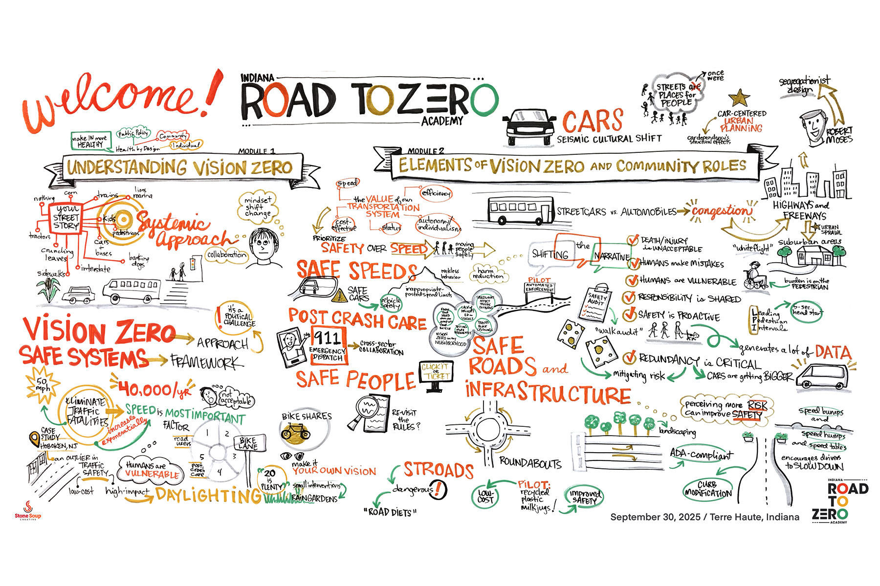 Right here in my city, community advocates, neighborhood leaders, transportation and public health professionals, planners, educators, and anyone committed to creating safer streets across Indiana convened for this full-day interactive training designed to equip community leaders, advocates, and professionals with tools to advance traffic safety initiatives with the goal of eliminating roadway fatalities in Indiana. I had the pleasure of taking visual notes for a mix of presentations, discussions, and hands-on activities, while participants explored the Vision Zero framework, learned practical advocacy skills, and left with a clear action plan.