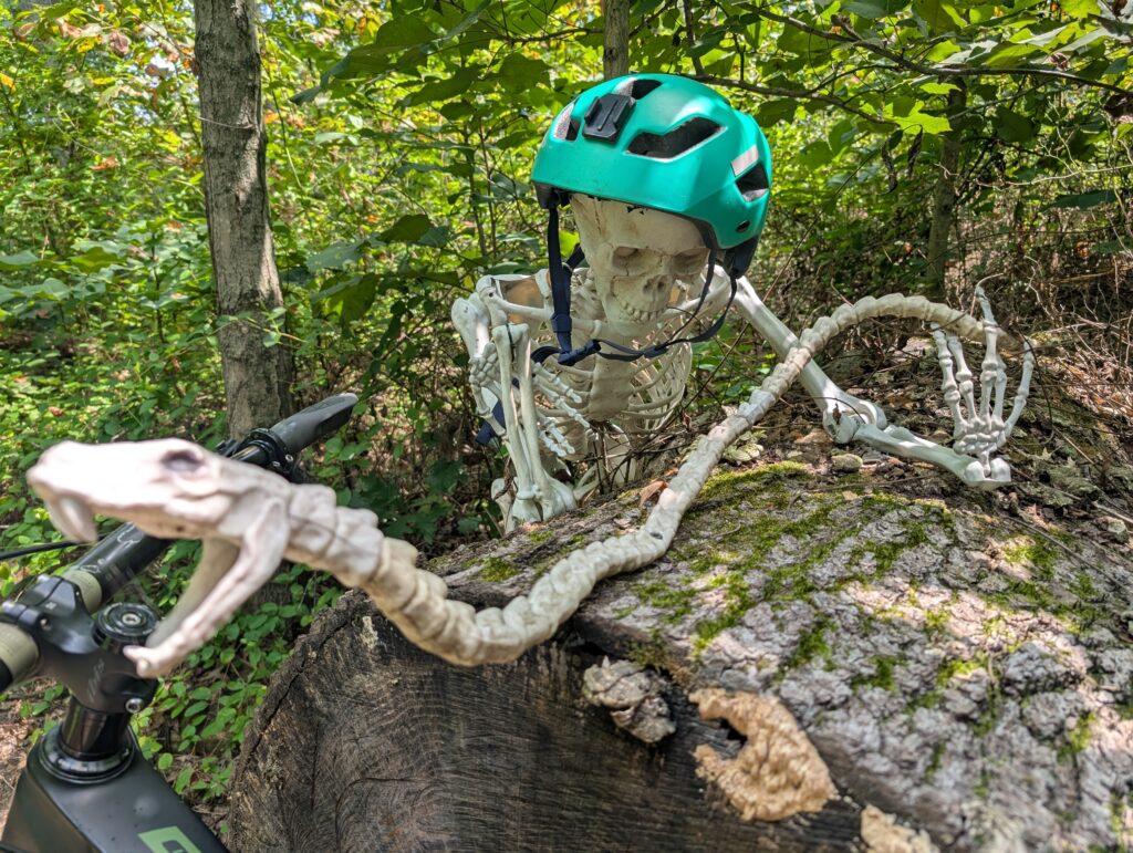 • The bad: on a new, fairly easy trail, I zoned out while looping the course. BAM! My handlebar clipped a tree and I went down hard (don’t worry — I’m okay).
